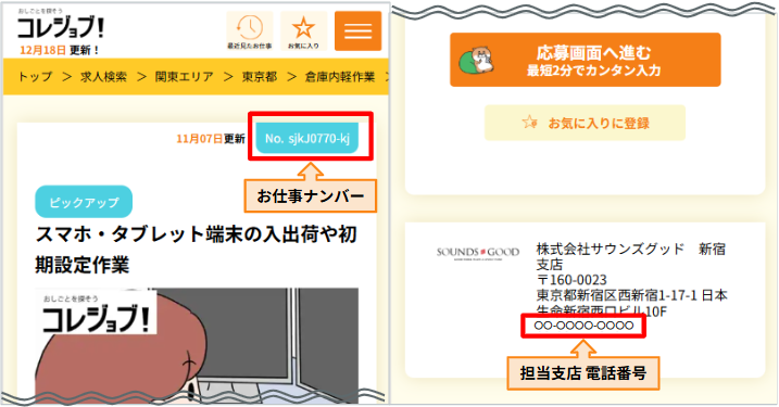 応募したい求人の右上に表示されているお仕事ナンバーをご確認の上、「お仕事ナンバー〇〇の条件を確認したい」とお伝えいただくと、スムーズにご案内できます。