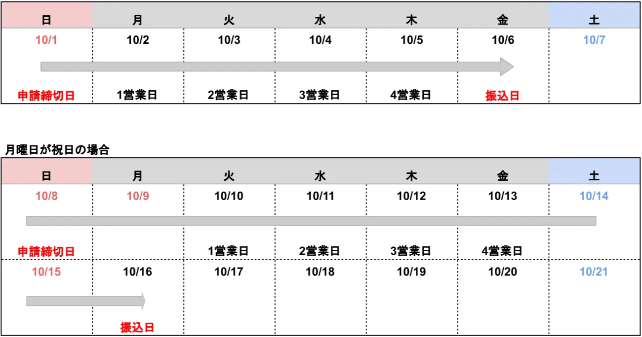 - 申請締切時間を過ぎた場合、翌営業日の振込となります